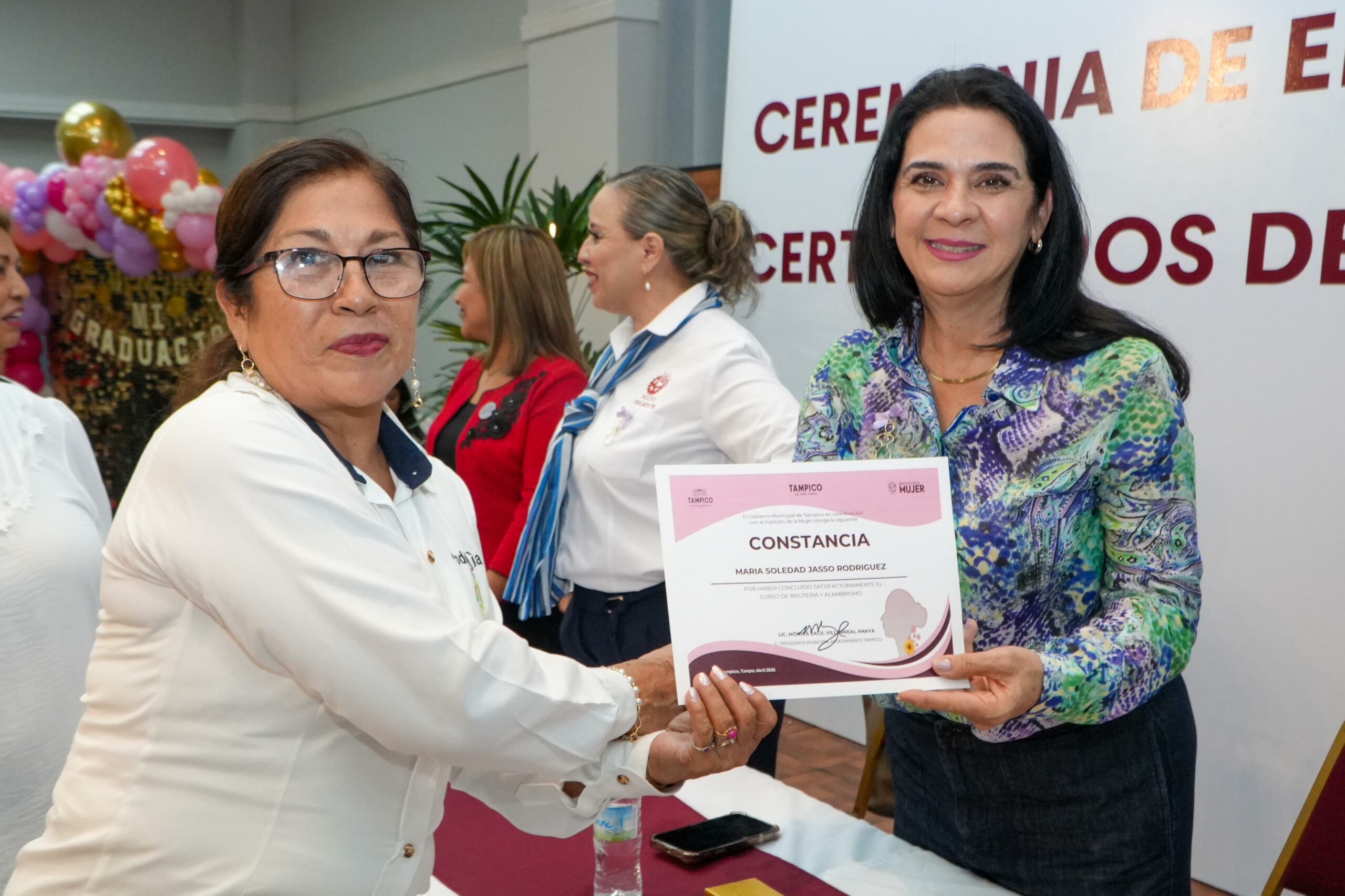 La Presidenta Municipal de Tampico, Mónica Villarreal Anaya, encabezó la ceremonia de entrega de constancias y certificados a las más de 400 participantes de los cursos y talleres que fueron impartidos en los módulos del Instituto de la Mujer.