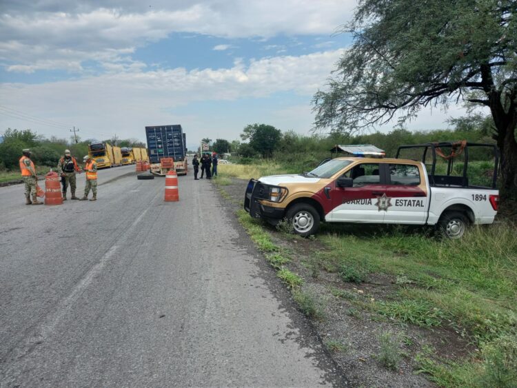 Hidalgo, Tamaulipas.- Detivado del desprendimiento del eje izquierdo del segundo remolque de un tractocamión, la circulación se encuentra cerrada en un carril de sur a norte de la Carretera Federal 85 Victoria-Monterrey.