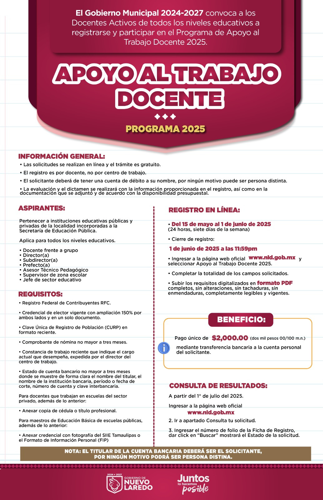 El Gobierno Municipal de Nuevo Laredo hace un llamado a los trabajadores del sector educativo en activo para que aprovechen los últimos días de registro en el Programa de Apoyo al Trabajo Docente, el cual permanecerá abierto hasta el 1 de junio de 2025.