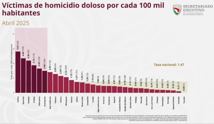 Ciudad Victoria, Tamaulipas. – De acuerdo al último reporte del Secretariado Ejecutivo del Sistema Nacional de Seguridad Pública, Tamaulipas se colocó entre las primeras cinco entidades federativas con menor tasa de víctimas por homicidios dolosos por cada 100 mil habitantes, con apenas 0.40%, y por debajo de la media nacional de 1.47%, al mes de abril de 2025.