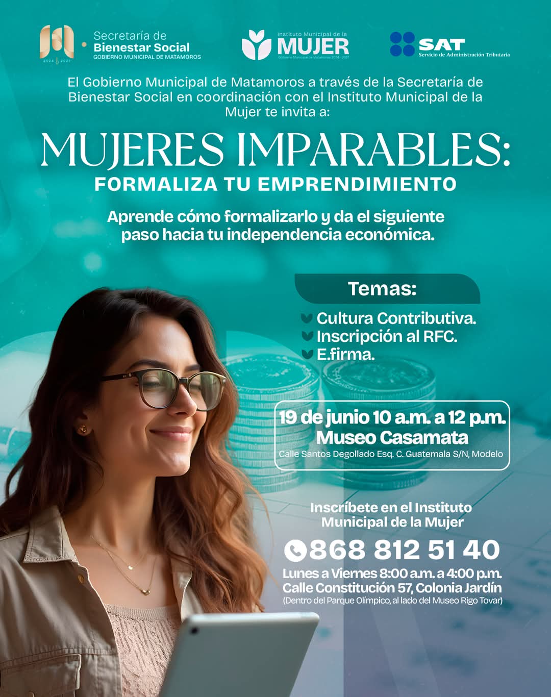 En esta ocasión, se invita a formar parte del programa: Mujeres imparables para de esta manera formalizar un emprendimiento. Este programa está dirigido a mujeres con espíritu emprendedor que ya cuenten con un negocio en marcha o que estén en proceso de iniciar uno. A través de esta iniciativa, se busca brindar las herramientas, conocimientos y acompañamiento necesarios para que logren estructurar su emprendimiento de manera formal, con bases sólidas y sostenibles.