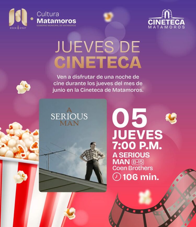 H. Matamoros, Tamaulipas.- Este jueves, la Cineteca Matamoros se convertirá en el punto de encuentro para los amantes del cine, con la proyección de “A Serious Man”, una aclamada película de los hermanos Coen. Esta cinta, reconocida por su singular mezcla de humor negro, drama existencial y una narrativa profundamente reflexiva, ofrece una experiencia cinematográfica única y envolvente.