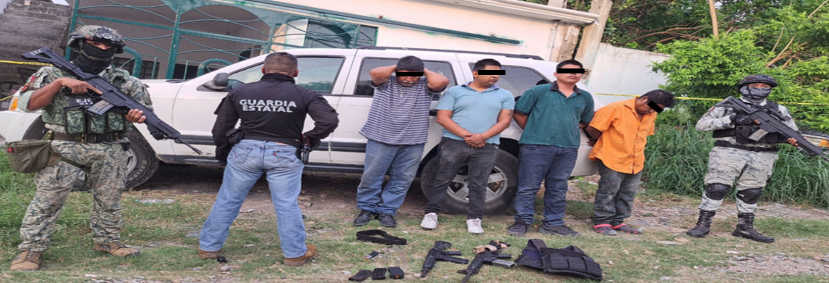 Se detuvo a cuatro personas, se aseguraron 16 cargadores, 520 cartuchos, 119 dosis de metanfetamina, 90 dosis de marihuana y un vehículo.
