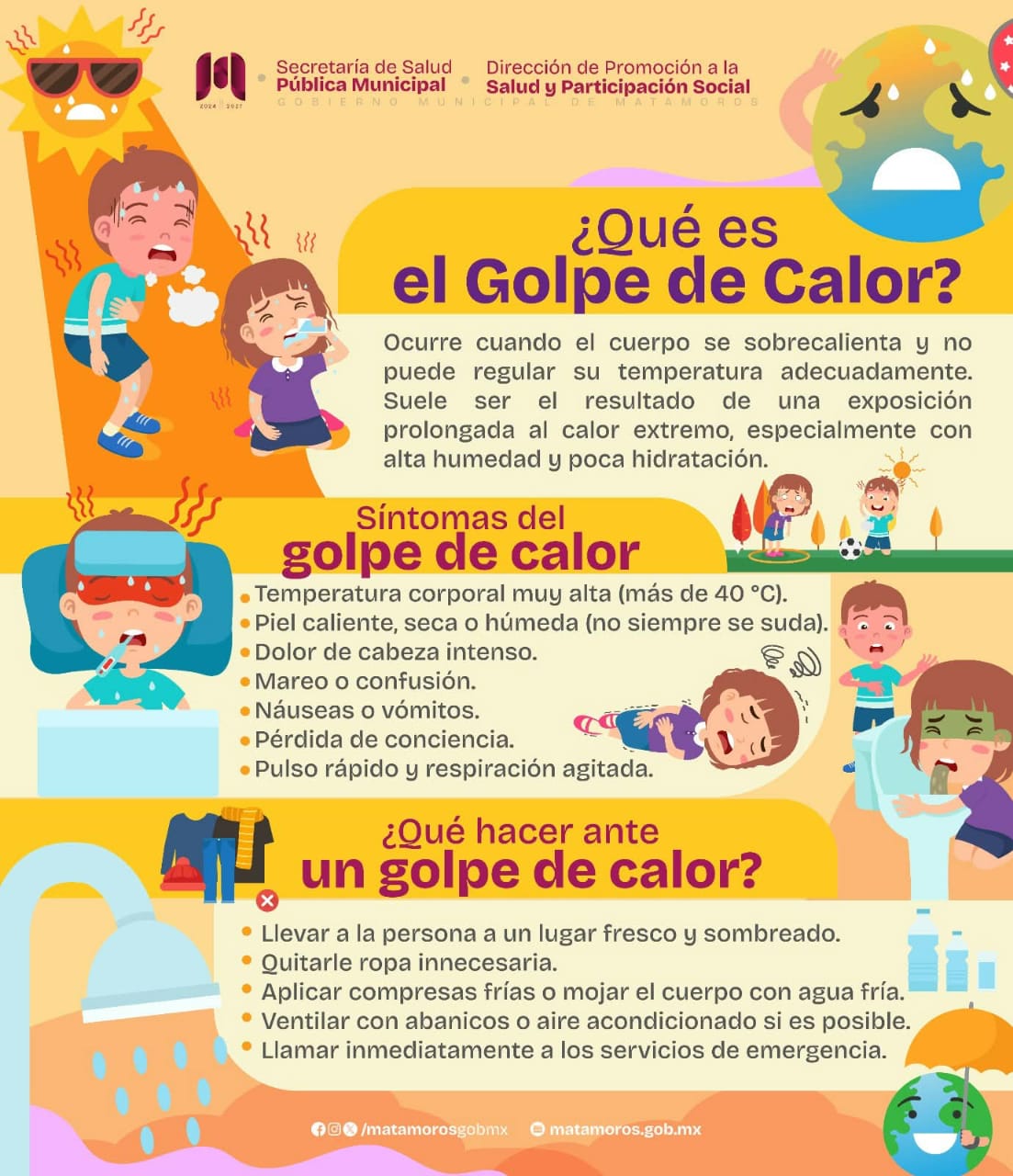 La prevención del golpe de calor es responsabilidad de todos, por lo que el Gobierno de Matamoros exhorta a la ciudadanía a tomar las medidas necesarias para protegerse a sí mismos y a sus seres queridos. Protejamos nuestra salud y la de quienes más queremos, tomando las precauciones adecuadas durante las temporadas de calor extremo.