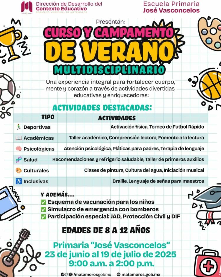H. Matamoros, Tamaulipas.- Este verano, la Dirección de Desarrollo del Contexto Educativo del gobierno municipal, lanzó una invitación a niñas y niños para formar parte del Campamento Multidisciplinario, que se llevará a cabo en las instalaciones de la Escuela Primaria “José Vasconcelos”.
