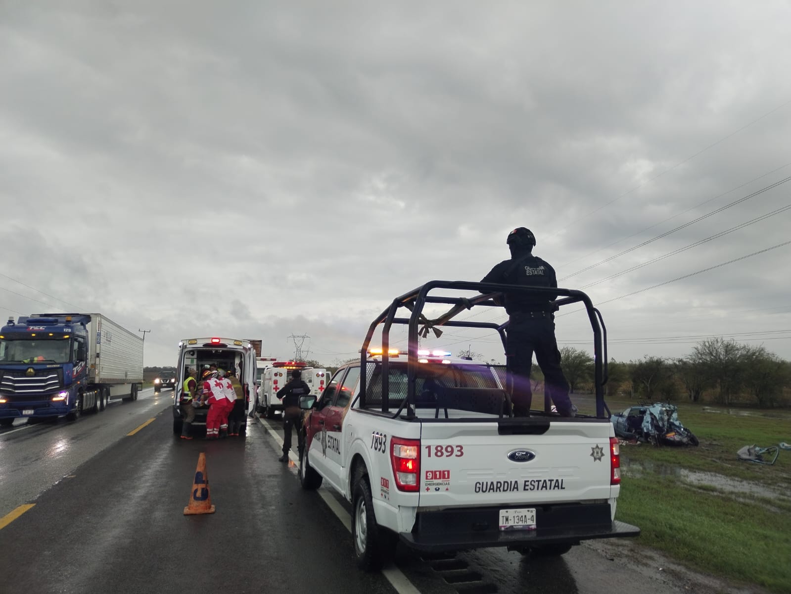 González, Tamaulipas.- Personal de la Guardia Estatal de Apoyo Carretero atendió un accidente vehicular en el kilómetro 9 del libramiento Villa Manuel – González, sobre la Carretera Federal número 80, donde un automóvil particular colisionó contra un tractocamión, dejando como saldo al menos cuatro personas lesionadas.