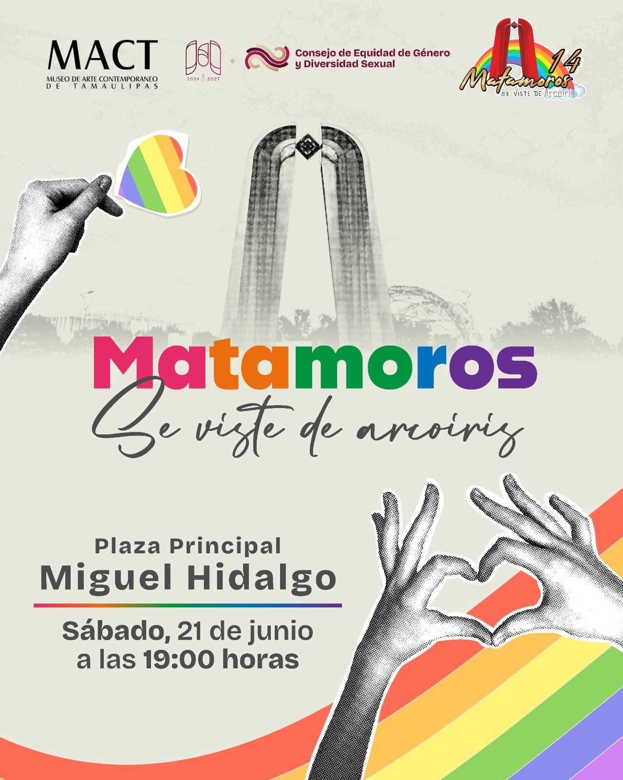 H. Matamoros, Tamaulipas.- El Gobierno de Matamoros, que preside Beto Granados, invita a la comunidad a unirse a la celebración del respeto, la diversidad y el amor en todas sus formas. Este sábado 21 de junio, la Plaza Principal Miguel Hidalgo se llenará de colores y orgullo, convirtiéndose en un espacio donde la comunidad pueda expresarse libremente y sentirse incluida.