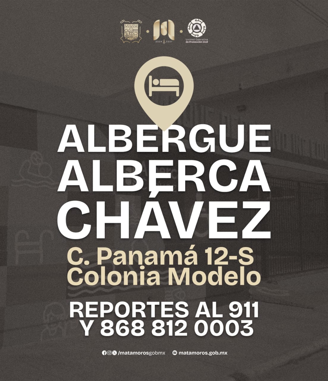 H. Matamoros, Tamaulipas.- En atención a la contingencia generada por las intensas lluvias registradas en nuestra ciudad, el Gobierno Municipal de Matamoros informa a la ciudadanía que ha sido habilitada la alberca Chávez como albergue temporal, con el objetivo de brindar resguardo seguro a las familias que se vean afectadas por las precipitaciones.