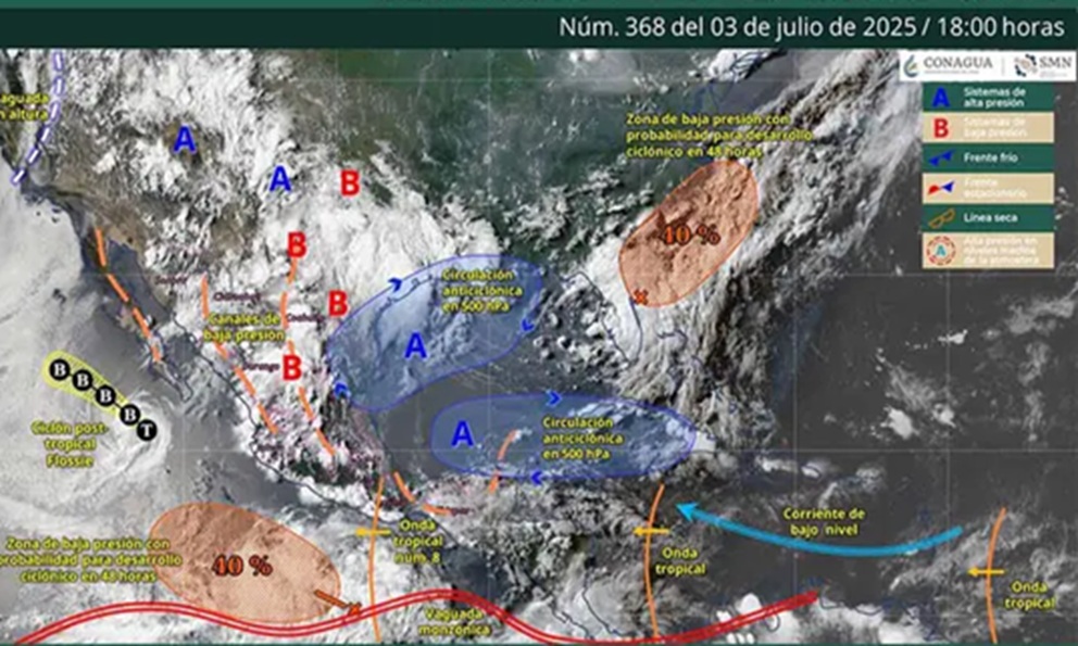 De acuerdo al Servicio Meteorológico Nacional (SMN), la zona de baja presión al sur de las costas de Chiapas y Oaxaca, asociada a la Onda Tropical número 8, mantiene 40 por ciento de probabilidad para desarrollo ciclónico en 48 horas y 80 por ciento en siete días.