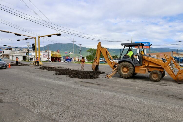 Para garantizar la circulación segura de vehículos, cuadrillas de trabajadores realizaron recorte de superficie, retiro de material dañado, aplicación de carpeta asfáltica y debida compactación en arterías colindantes con la avenida primaria José Sulaimán Chagnón.