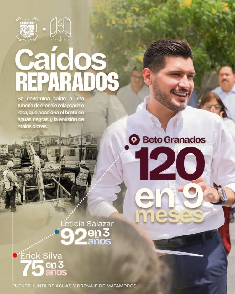 Matamoros, Tamaulipas.– Con paso firme y resultados visibles, el Gobierno de Matamoros que encabeza Beto Granados continúa atendiendo una de las principales problemáticas de la ciudad: los caídos, es decir, las tuberías de drenaje colapsadas o rotas que generan brotes de aguas negras y malos olores. En apenas nueve meses de administración, ya se han reparado 120 caídos, una cifra que supera ampliamente lo logrado por gobiernos anteriores en periodos de tres años.