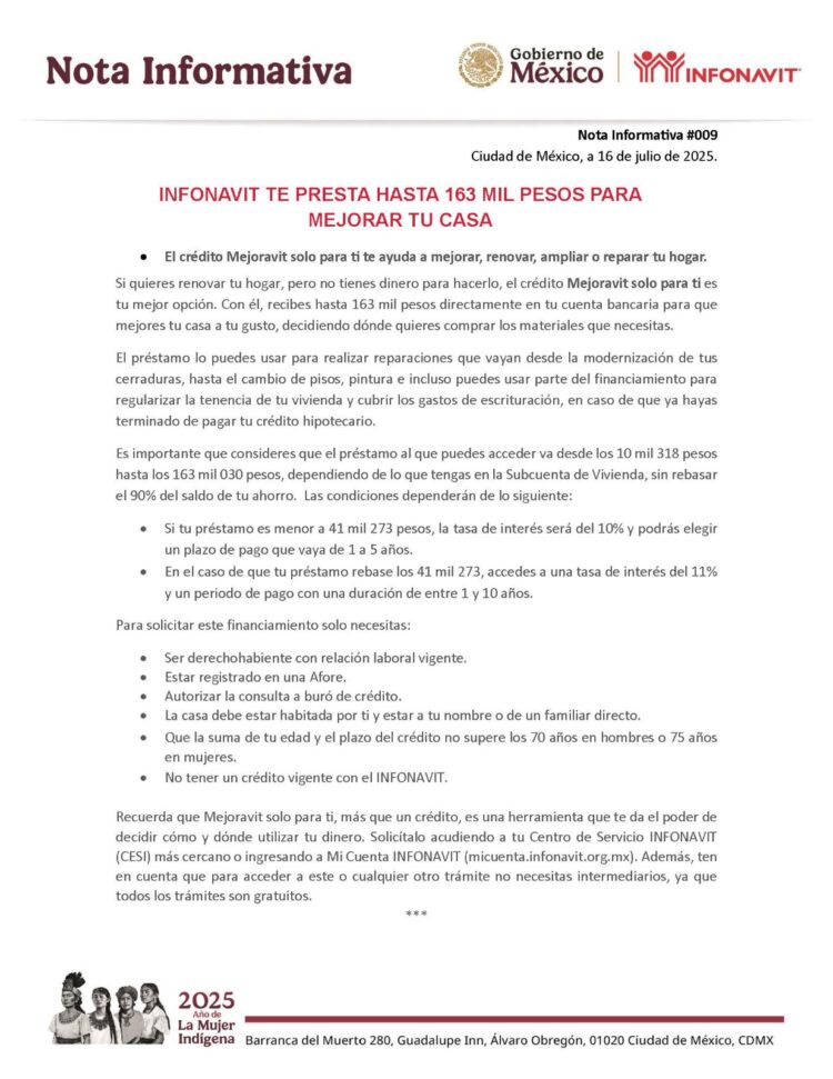 Recuerda que Mejoravit solo para ti, más que un crédito, es una herramienta que te da el poder de decidir cómo y dónde utilizar tu dinero. Solicítalo acudiendo a tu Centro de Servicio INFONAVIT (CESI) más cercano o ingresando a Mi Cuenta INFONAVIT (micuenta.infonavit.org.mx). Además, ten en cuenta que para acceder a este o cualquier otro trámite no necesitas intermediarios, ya que todos los trámites son gratuitos.