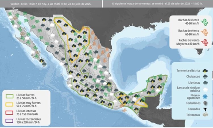 El Servicio Meteorológico Nacional (SMN) pronosticó que los aguaceros fuertes continuarán en 10 entidades del país, y el clima caluroso prevalecerá en otros 5 estados este miércoles 23 de julio de 2025.