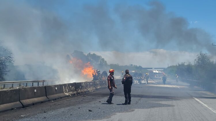 Mainero, Tamaulipas.- Derivado de la volcadura y explosión del segundo remolque de una pipa a la altura del kilómetro 126 la circulación se encuentra cerrada en la Carretera Federal 85 Victoria-Monterrey.