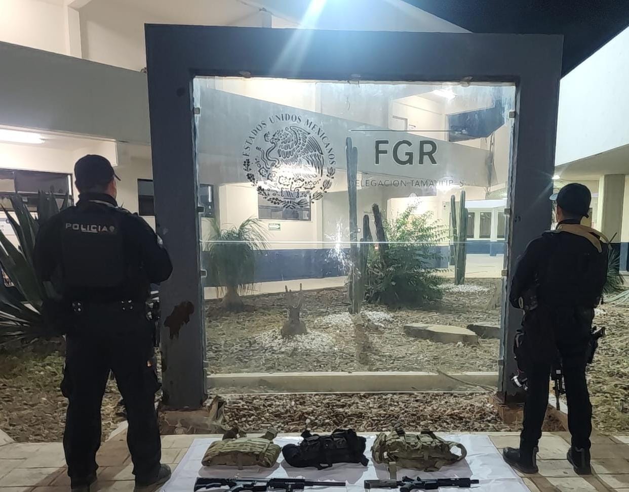 Reynosa, Tamaulipas.- Personal de la Guardia Estatal aseguró dos vehículos con reporte de robo en el extranjero, armamento y equipo táctico, durante un operativo realizado en la autopista Monterrey–Reynosa, tras un reporte ciudadano sobre la presencia de personas armadas.