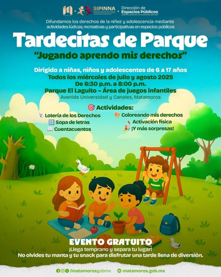 Matamoros, Tam. — Durante este verano, el Parque El Laguito se ha convertido en un punto de encuentro para niñas, niños y adolescentes gracias a las “Tardecitas de Parque”, una iniciativa impulsada por el Gobierno de Beto Granados.