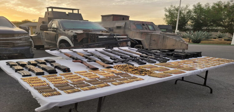 En Camargo, se aseguraron cinco vehículos, tres de ellos con blindaje artesanal y dos con reporte de robo, en su interior se aseguró un fusil Barrett, nueve armas largas, 78 cargadores, 1,410 cartuchos, 32 artefactos explosivos improvisados.