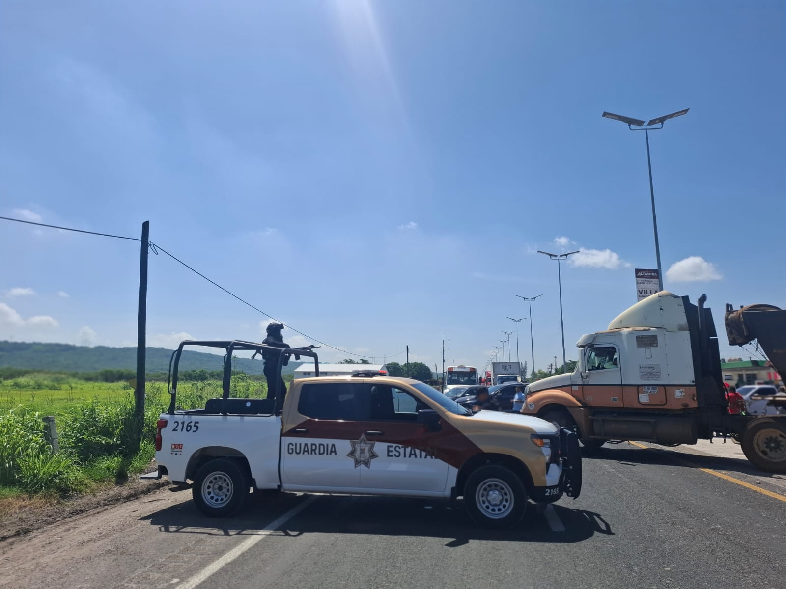 Altamira, Tamaulipas.- Derivado de una manifestación pacífica, la circulación vial se encuentra cerrada en ambos sentidos de la Carretera Federal 80 Tampico-Mante.