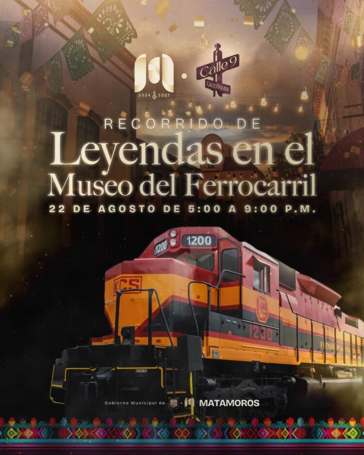 H. Matamoros, Tamaulipas.- Como parte de las actividades culturales impulsadas por la administración del alcalde Beto Granados, este viernes 22 de agosto se llevará a cabo el Recorrido de Leyendas en el Museo del Ferrocarril de Matamoros, en el marco de la gran reinauguración de la tradicional Callejoneada de la Calle 9.
