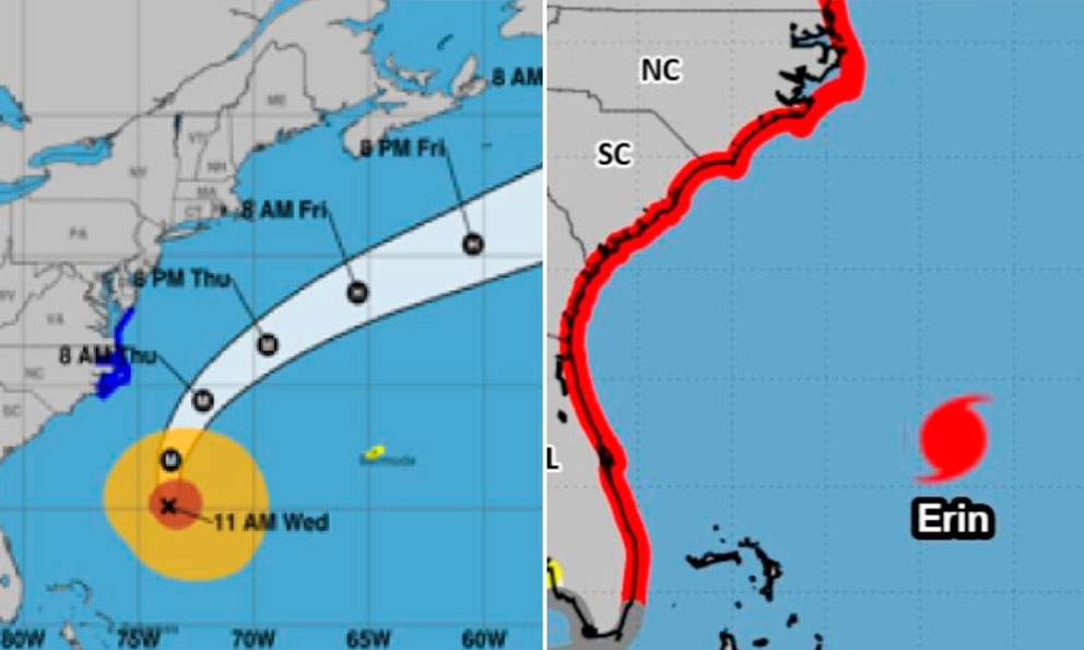 La agencia federal con sede en Miami subrayó que Erin, un huracán de categoría 2 en la escala Saffir-Simpson de un total de 5, las playas de casi toda la costa este de Estados Unidos registrarán condiciones extremadamente peligrosas, con oleaje fuerte y corrientes de resaca que amenazan la vida de bañistas y surfistas.