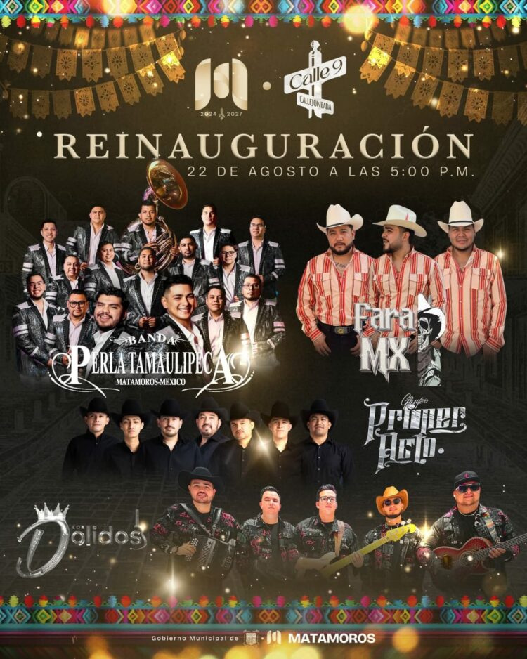 Matamoros, Tam.- El Gobierno de Matamoros, encabezado por el alcalde Beto Granados, invita a toda la ciudadanía a disfrutar de la Gran Reinauguración de la Callejoneda de la Calle 9, este viernes 22 de agosto a partir de las 5:00 p.m. Un espacio que se renueva para seguir siendo punto de encuentro cultural y familiar en la ciudad.