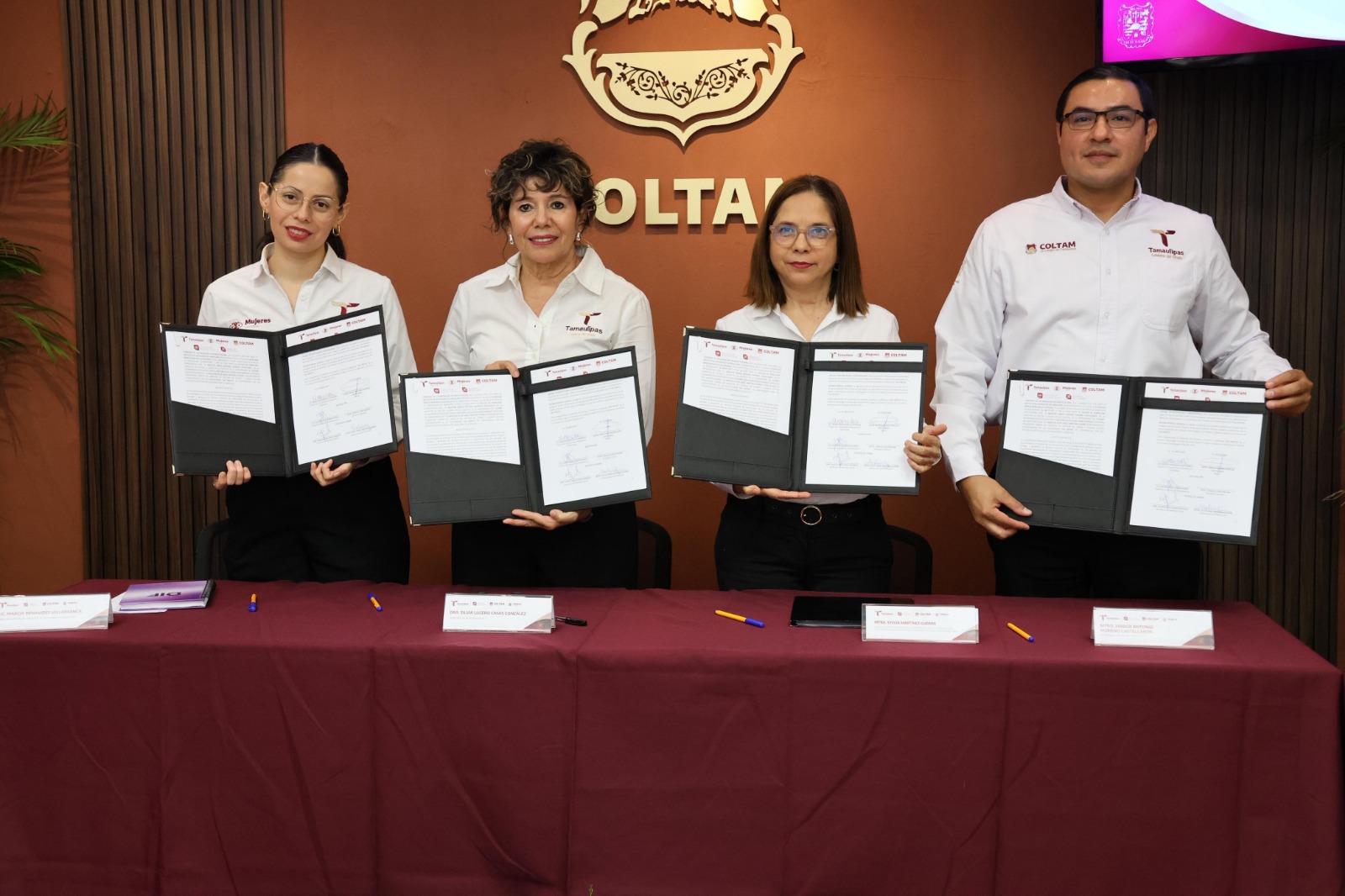 Ciudad Victoria, Tamaulipas. – Con el objetivo de fortalecer el desarrollo de formación continua y la investigación en materia de género y generar información que contribuya a la elaboración de políticas públicas más efectivas, el Instituto de las Mujeres en Tamaulipas (IMT) y el Colegio de Tamaulipas (COLTAM) firmaron un convenio de colaboración interinstitucional en las instalaciones del Colegio de Tamaulipas, evento que contó con la presencia de autoridades, entre ellas Silvia Casas, secretaria de Bienestar Social y Sylvia Isabel Martínez, subsecretaria de Planeación de la Secretaría de Educación.