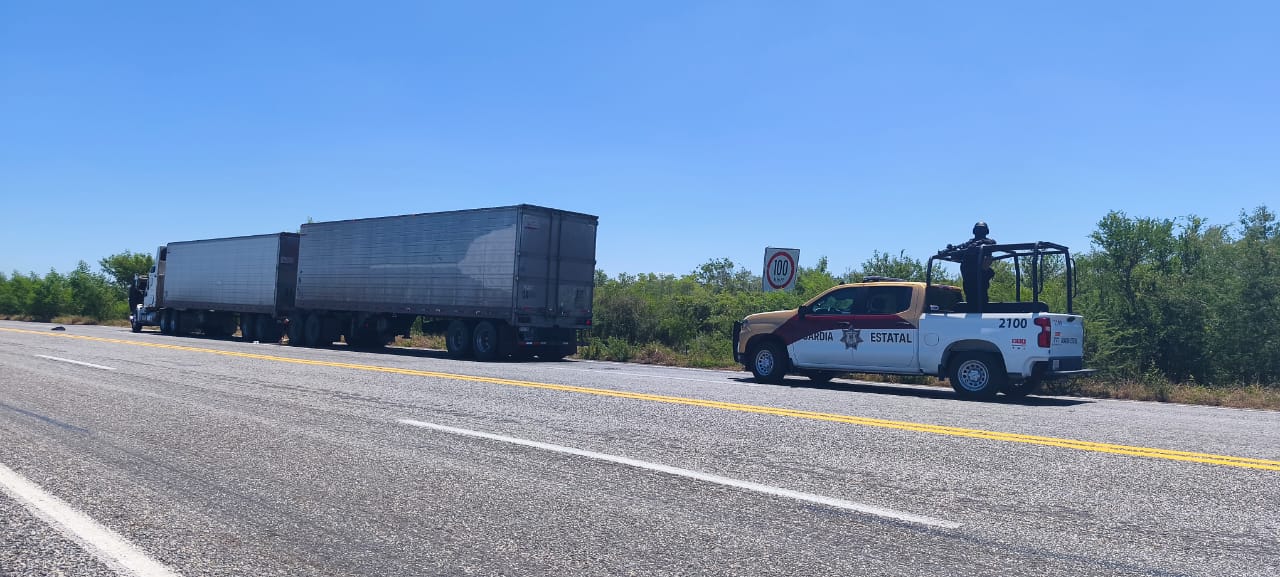 Padilla, Tamaulipas.- Al efectuar recorridos de seguridad y vigilancia sobre la Carretera Federal 101 Victoria-Matamoros, personal de la Guardia Estatal de Apoyo Carretero visualizó a un tráiler varado sobre la cinta asfáltica en el kilómetro 70.