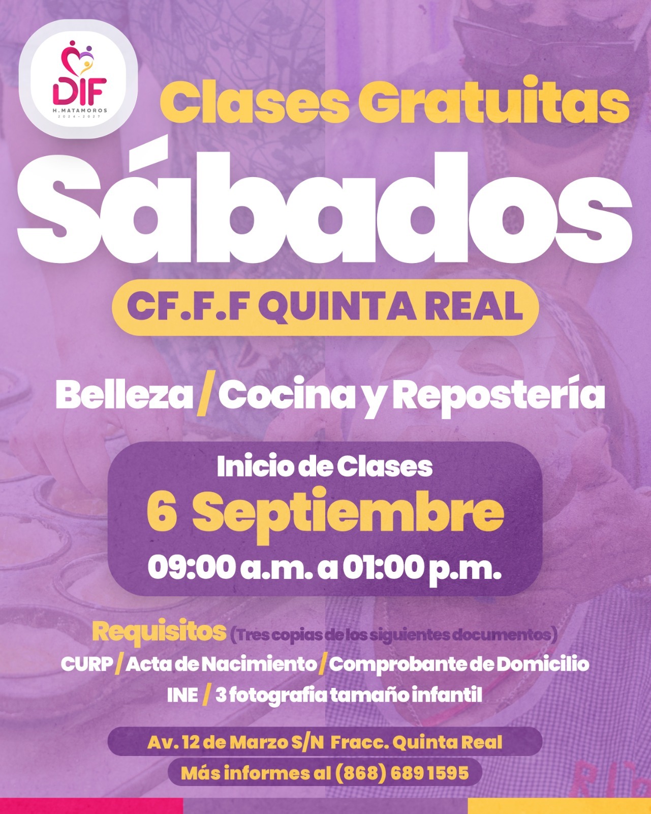 Las clases darán inicio el próximo sábado 06 de septiembre, en horario de 09:00 de la mañana a 01:00 de la tarde, en el Centro de Fortalecimiento Familiar Quinta Real.