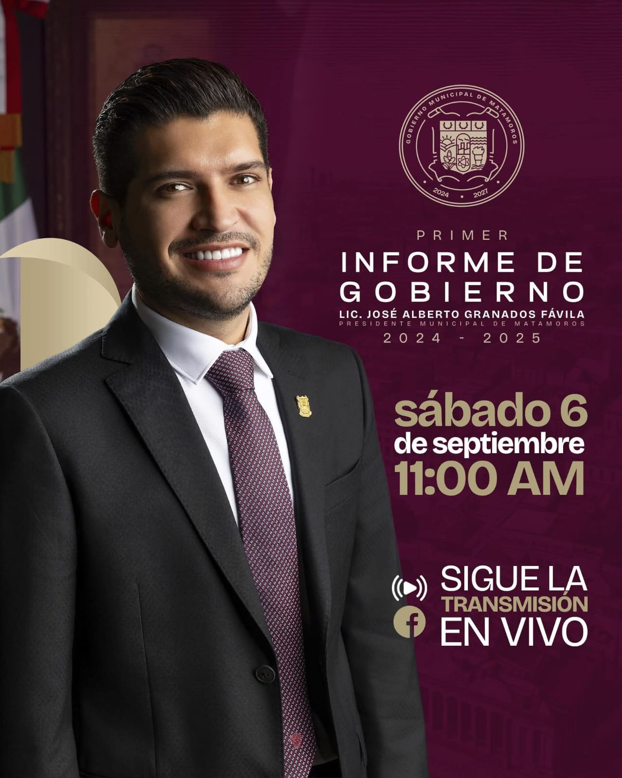 H. Matamoros, Tamaulipas.- Este sábado 6 de septiembre, en punto de las 11:00 de la mañana, el Presidente Municipal de Matamoros, Beto Granados, llevará a cabo la presentación de su Primer Informe de Gobierno, acto que representa un importante ejercicio de transparencia y rendición de cuentas ante la ciudadanía.