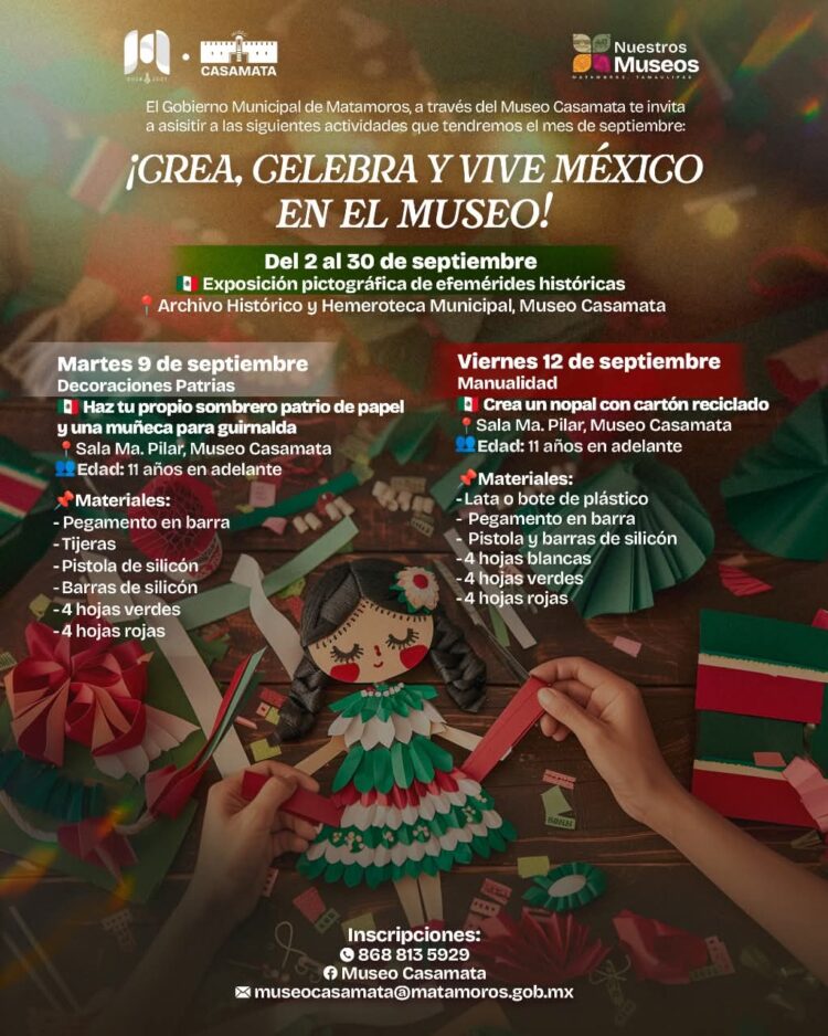 H. Matamoros, Tamaulipas.- El Gobierno de Matamoros, que preside el alcalde Beto Granados y el Museo Casamata invitan a la ciudadanía a participar en las actividades programadas durante septiembre, mes en el que celebramos con orgullo nuestras tradiciones mexicanas.