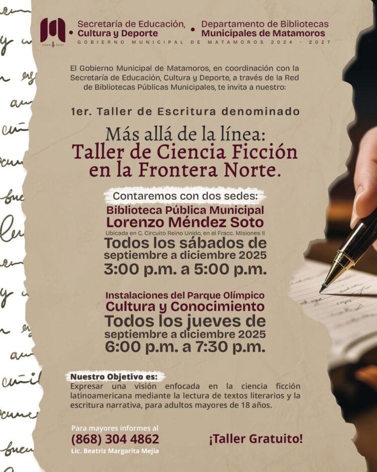 Matamoros, Tam.– El Gobierno de Beto Granados informó la puesta en marcha del Primer taller de escritura: “Más allá de la línea: Taller de Ciencia Ficción en la Frontera Norte”, una propuesta cultural que busca impulsar la creatividad de las y los matamorenses a través de la lectura y la escritura.