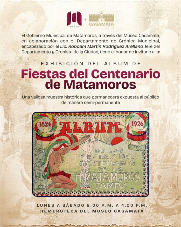 Matamoros, Tam.- El Gobierno de Beto Granados informó que el Museo Casamata presenta la Exhibición del Álbum de Fiestas del Centenario de Matamoros, una valiosa muestra histórica que permite a la comunidad conocer y revivir momentos significativos de la ciudad.