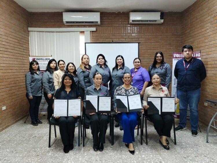 Rubricaron el convenio: la Lic. Cynthia Canturosas Villarreal, Presidenta del Consejo Consultivo del Instituto Municipal de la Mujer; Lic. Cynthia Rodríguez Leija, Directora General de INMUJER; la Ing. Patricia Moreno Arvizu, Directora del CECATI 1993; la Lic. Hilda Raquel Rodríguez Niño, Trabajadora Social de CECATI 193 y la Lic. Areli Cortez Salinas, Coordinadora de Capacitación y Vinculación de INMUJER Nuevo Laredo.