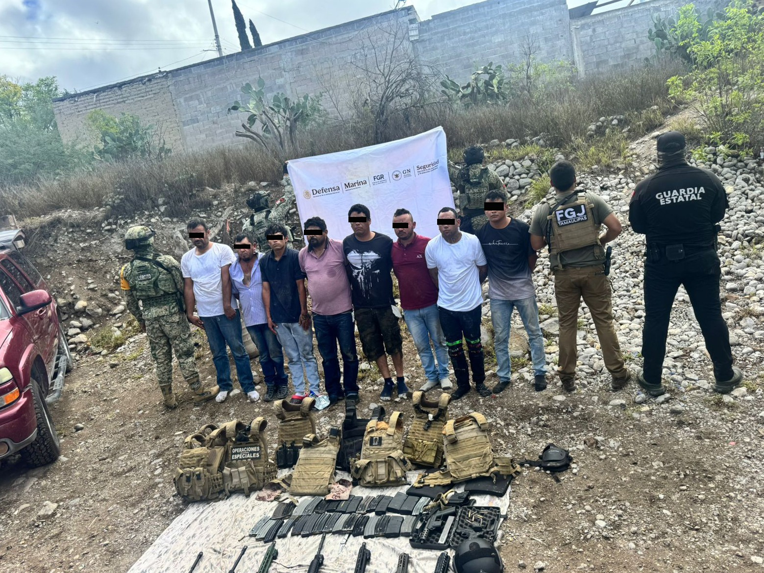 En Tula, se detuvo a ocho personas, se aseguraron nueve armas de fuego, una subametralladora, 35 cargadores, 2,640 cartuchos, nueve chalecos tácticos, dos cascos balísticos y tres vehículos, uno de ellos con blindaje artesanal.