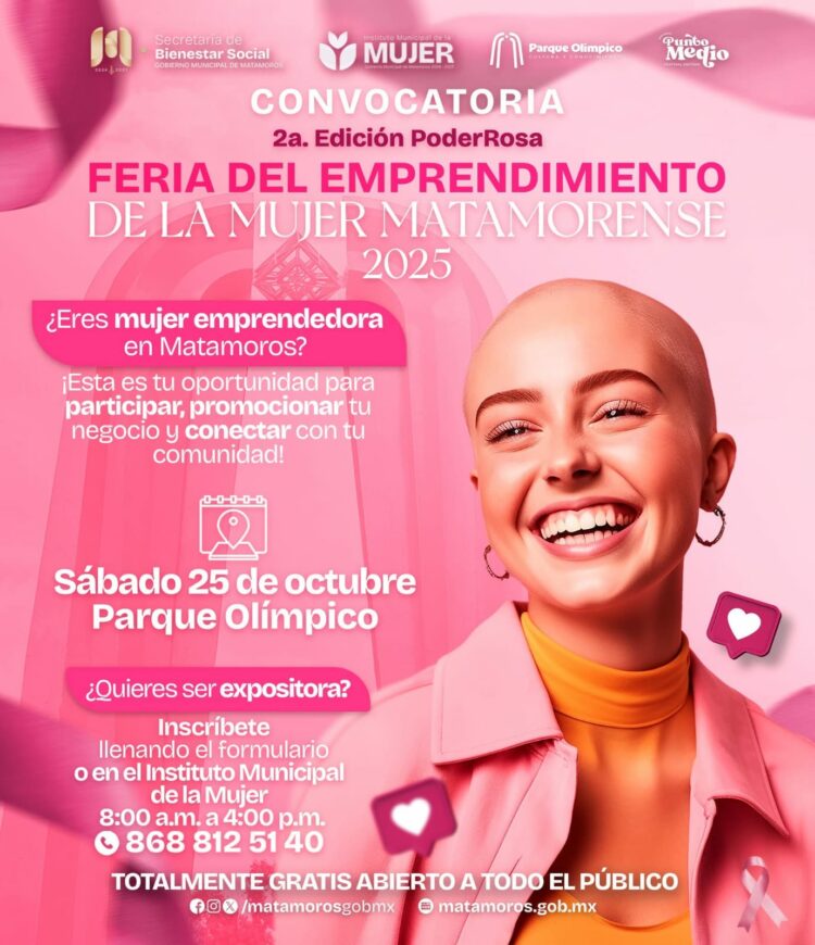 H. Matamoros, Tam.- El Gobierno Municipal que encabeza el alcalde Beto Granados informó la apertura de la convocatoria para la 2ª edición de PoderRosa / Feria del Emprendimiento de la Mujer, un espacio diseñado para impulsar a las mujeres emprendedoras de Matamoros, brindándoles la oportunidad de dar a conocer sus negocios y fortalecer su conexión con la comunidad.