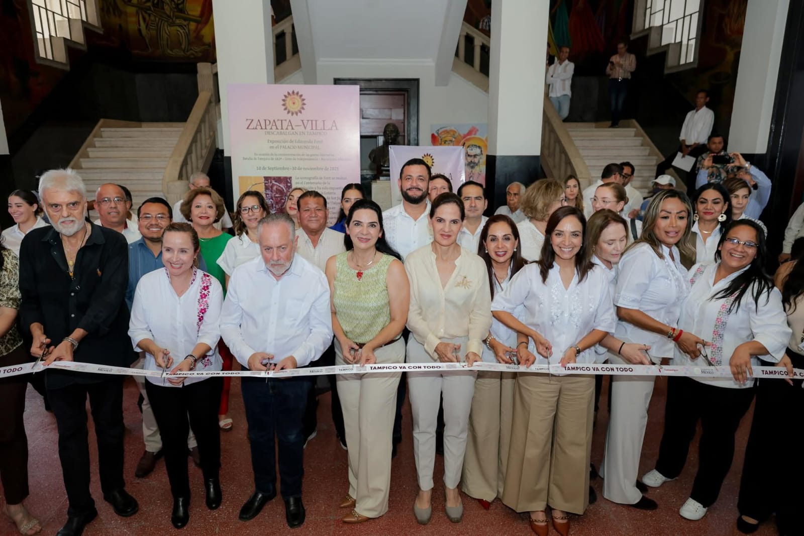 Con motivo de la conmemoración de las fiestas patrias, la Presidenta Municipal de Tampico, Mónica Villarreal Anaya, inauguró este jueves la exposición “Zapata-Villa Descabalgan en Tampico”, del reconocido artista plástico y escritor tampiqueño Edmundo Font, en el vestíbulo del Palacio Municipal.