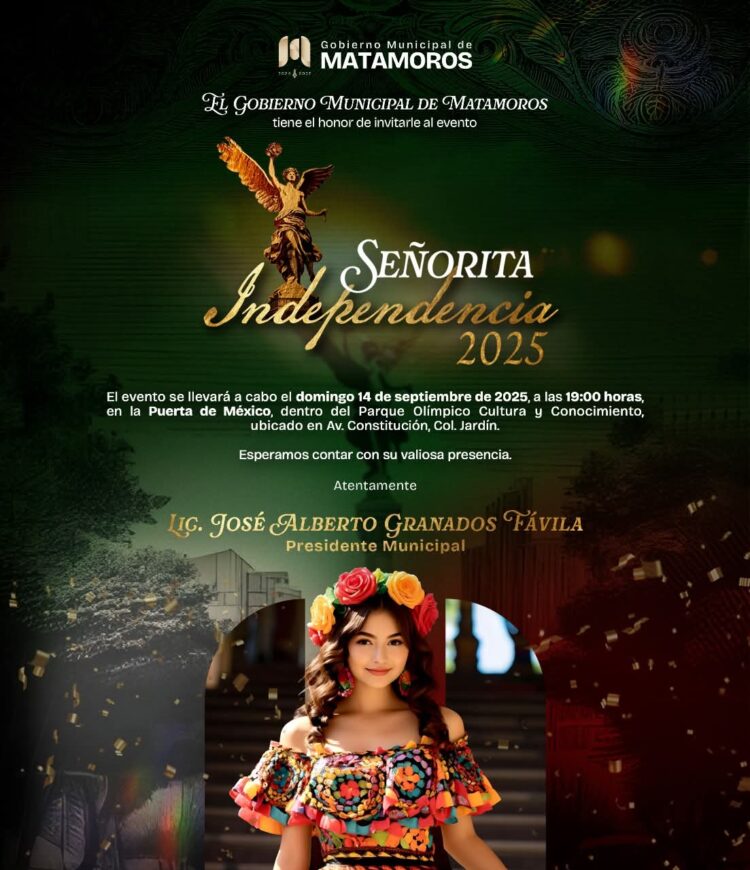 H. Matamoros, Tamaulipas.- El gobierno de Beto Granados extiende una cordial invitación a toda la comunidad para asistir al certamen Señorita Independencia 2025, un evento que promete ser una noche inolvidable llena de talento, cultura y orgullo mexicano. Esta celebración tiene como objetivo enaltecer nuestras raíces y reconocer el carisma y compromiso de las jóvenes matamorenses.