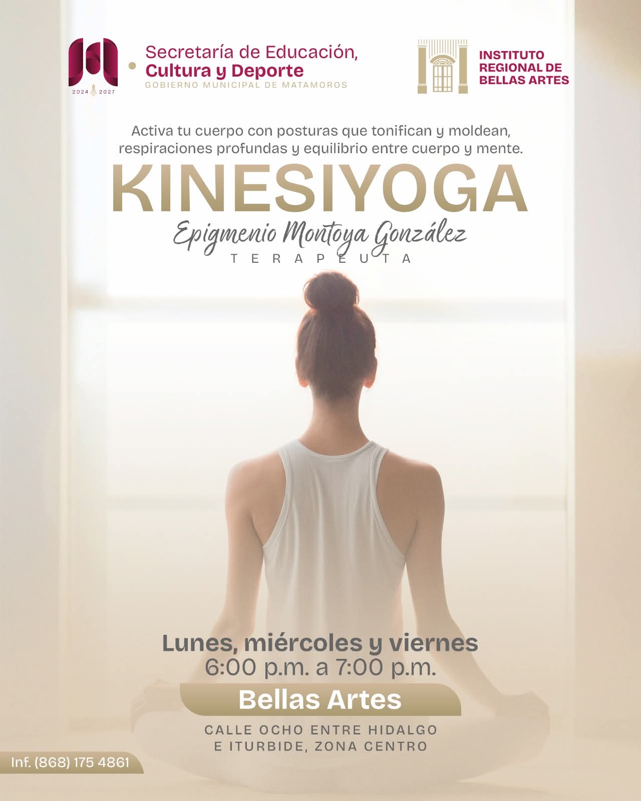 Matamoros, Tamps.– El Gobierno de Beto Granados informó que se llevan a cabo sesiones de Kinesiyoga en el Instituto Regional de Bellas Artes de Matamoros (IRBAM), con el objetivo de brindar a la ciudadanía un espacio de armonía entre cuerpo y mente.