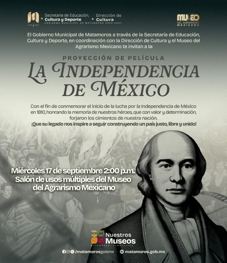 H. Matamoros, Tamaulipas.- El Gobierno Municipal que encabeza Beto Granados invita a la comunidad de Matamoros a participar en una emotiva actividad cultural con motivo de las celebraciones patrias: la proyección especial de la película “La Independencia de México”, un homenaje audiovisual al inicio del movimiento que marcó el rumbo de nuestra nación.