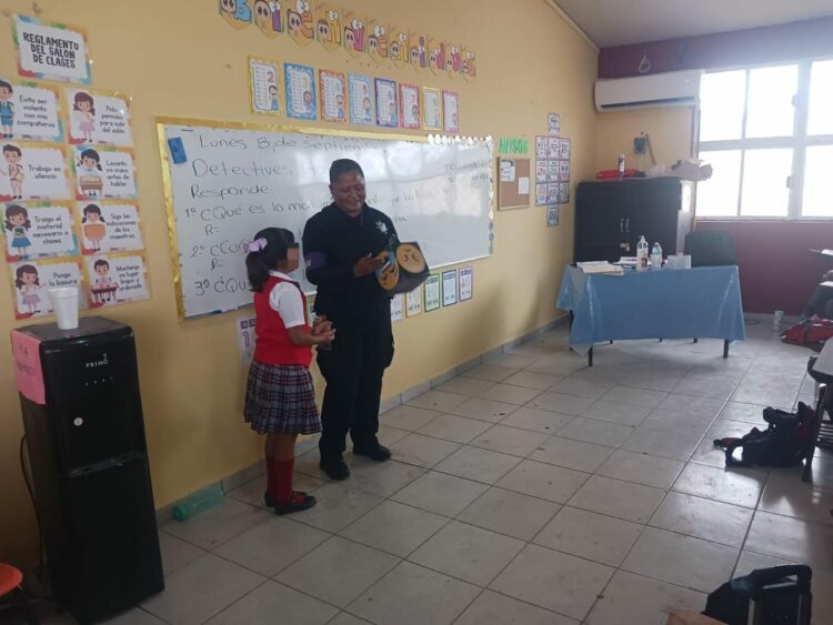Reynosa, Tamaulipas.- Dentro de la estrategia integral de prevención del delito, personal de la Guardia Estatal de Género visitó diferentes planteles de Reynosa para brindar información a niños y niñas que cursan el nivel primaria, esto con el objetivo de brindar información sobre cómo prevenir y atender conductas violentas y hechos delictivos que podrían presentarse en sus diferentes entornos.