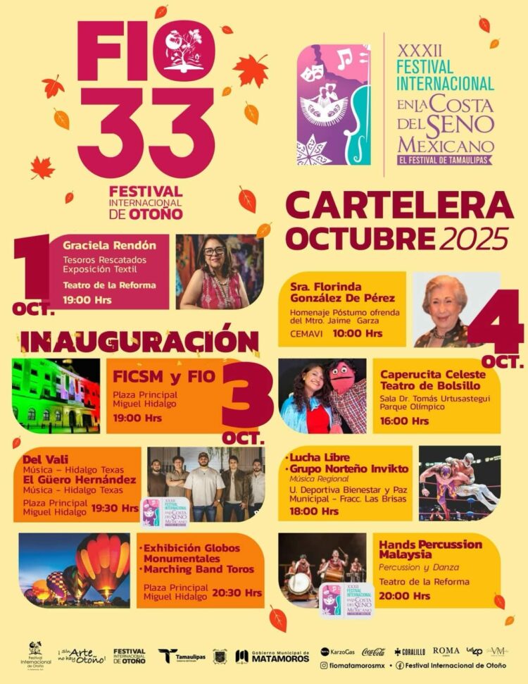 Matamoros, Tam.- El Gobierno de Beto Granados informó que Matamoros se prepara para brillar con la 33ª edición del Festival Internacional de Otoño, que se llevará a cabo del 3 al 12 de octubre en distintos escenarios de la ciudad.