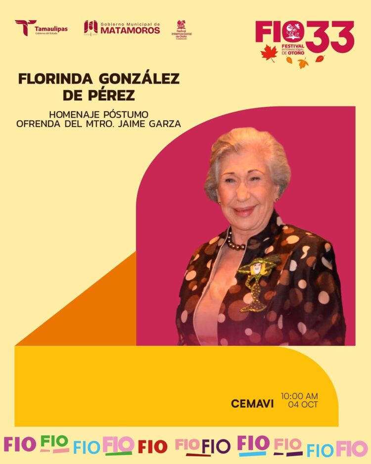 H. Matamoros, Tamaulipas.- El Gobierno Municipal de Matamoros, encabezado por el alcalde Beto Granados, invita a la ciudadanía a participar en un emotivo homenaje póstumo en honor a la Sra. Florinda González de Pérez, Presidenta Fundadora del Festival Internacional de Otoño (FIO). Este acto se realizará en el marco de la 33ª edición de dicho festival, como un reconocimiento a su invaluable aportación al desarrollo cultural de la ciudad.