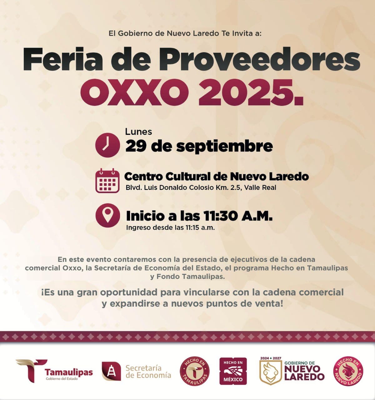 El Gobierno de Nuevo Laredo hace un llamado a los emprendedores y empresarios locales para que participen en la Feria de Proveedores OXXO 2025, que se llevará a cabo el próximo lunes 29 de septiembre en el Centro Cultural de Nuevo Laredo, a partir de las 11:30 de la mañana.
