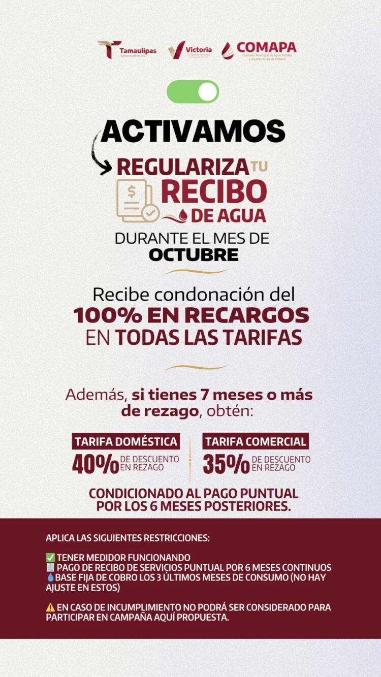 La campaña “Regulariza tu recibo” se mantendrá vigente ÚNICAMENTE EL MES DE OCTUBRE y las cuentas quedan condicionadas a ser USUARIOS PUNTUALES DE PAGO POR LOS PRÓXIMOS 6 MESES.
