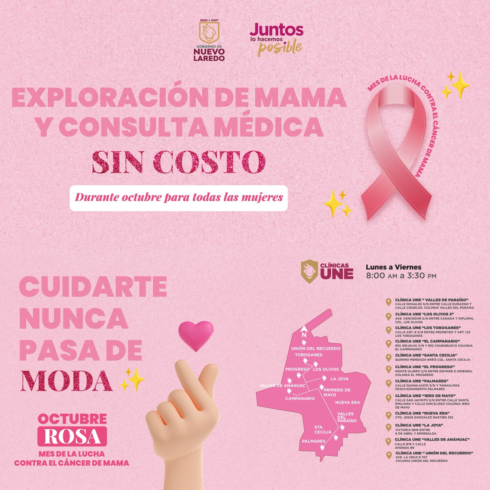 En el marco de Octubre Rosa, el Gobierno Municipal de Nuevo Laredo invita a todas las mujeres a aprovechar la campaña gratuita de exploración de mama y consulta médica que se realiza en las Clínicas UNE.