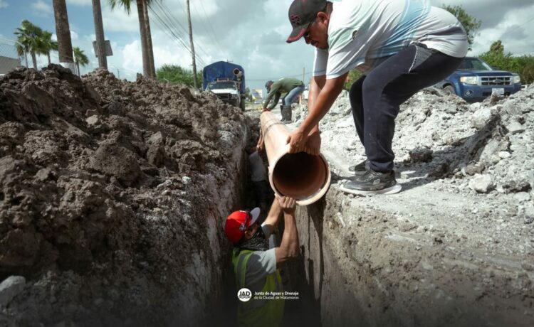 H. Matamoros, Tamaulipas.- El alcalde Beto Granados supervisó los avances de la obra de rehabilitación de la línea sanitaria en la carretera Sendero Nacional, donde se instala tubería de 12 pulgadas para mejorar el servicio y prevenir futuros colapsos.