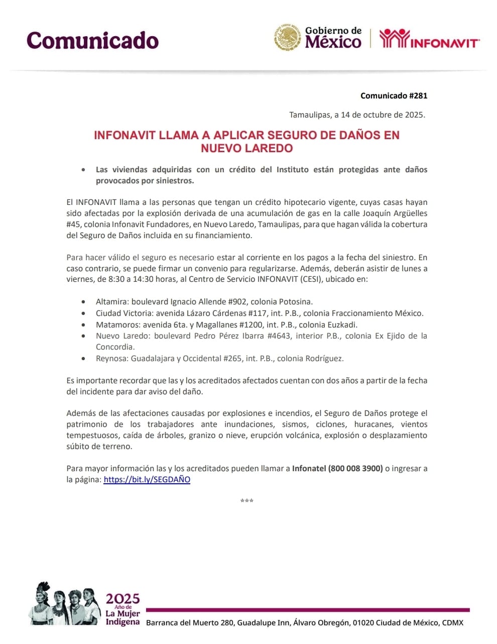 El INFONAVIT llama a las personas que tengan un crédito hipotecario vigente, cuyas casas hayan sido afectadas por la explosión derivada de una acumulación de gas en la calle Joaquín Argüelles #45, colonia Infonavit Fundadores, en Nuevo Laredo, Tamaulipas, para que hagan válida la cobertura del Seguro de Daños incluida en su financiamiento.