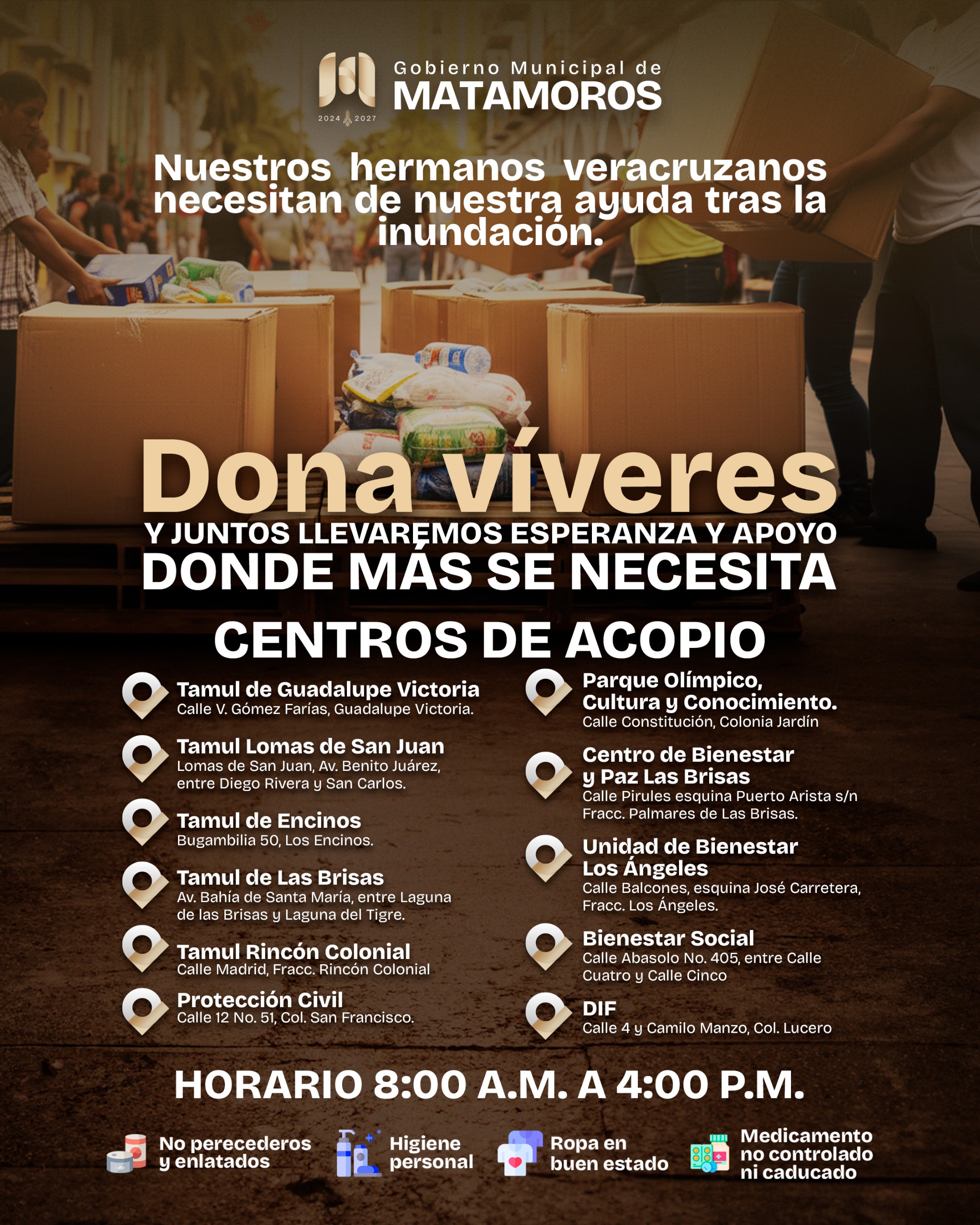 Matamoros, Tamaulipas.– El Gobierno de Beto Granados convoca a la ciudadanía a sumarse a la colecta de víveres para apoyar a las familias veracruzanas afectadas por las recientes inundaciones. Se recibirán alimentos no perecederos, artículos de higiene personal, ropa en buen estado y medicamentos que no estén caducos ni sean de control especial.