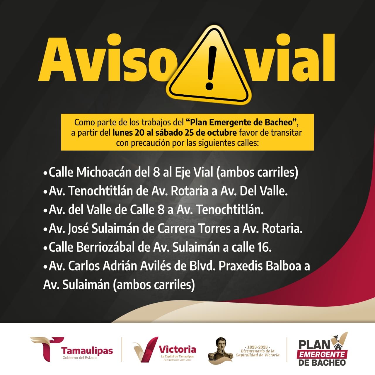 Cd. Victoria, 19 de octubre 2025. – Para que ciudadanos y conductores tomen previsión en sus rutas de traslado a centros laborales y educativos, el gobierno de Victoria informa que este lunes el Programa Emergente de Bacheo continuará en distintos sectores de la ciudad.