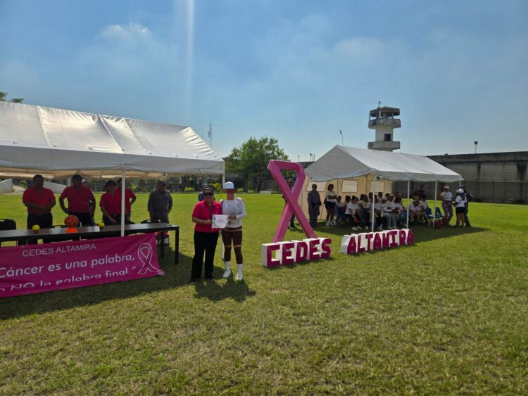 Altamira, Tamaulipas.– En el marco del Día Mundial de la Lucha contra el Cáncer de Mama, el Centro de Ejecución de Sanciones (CEDES) de Altamira realizó el “Rally Deportivo Femenil”, actividad orientada a promover la salud, la conciencia preventiva y la reinserción social entre las mujeres privadas de la libertad.